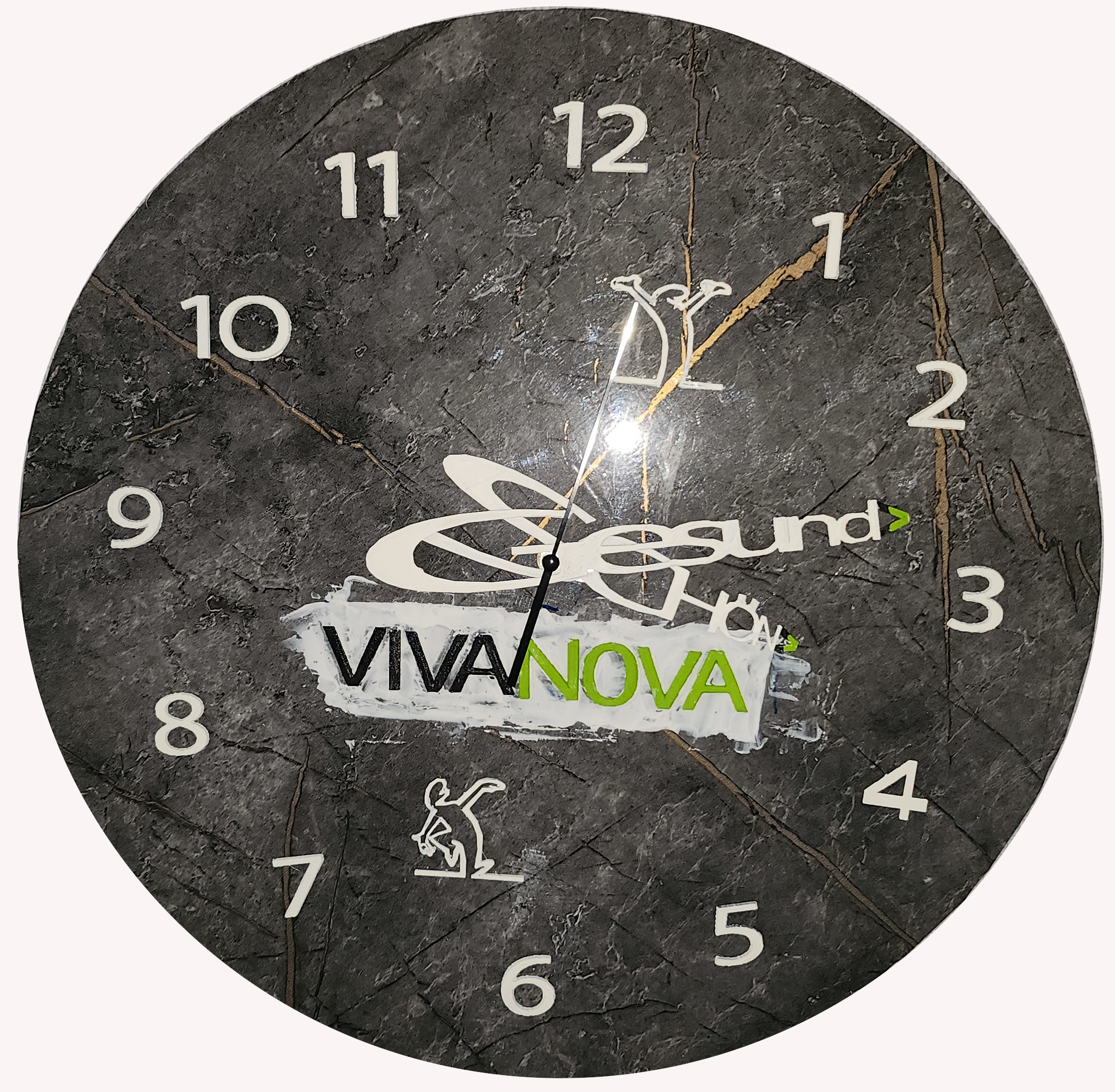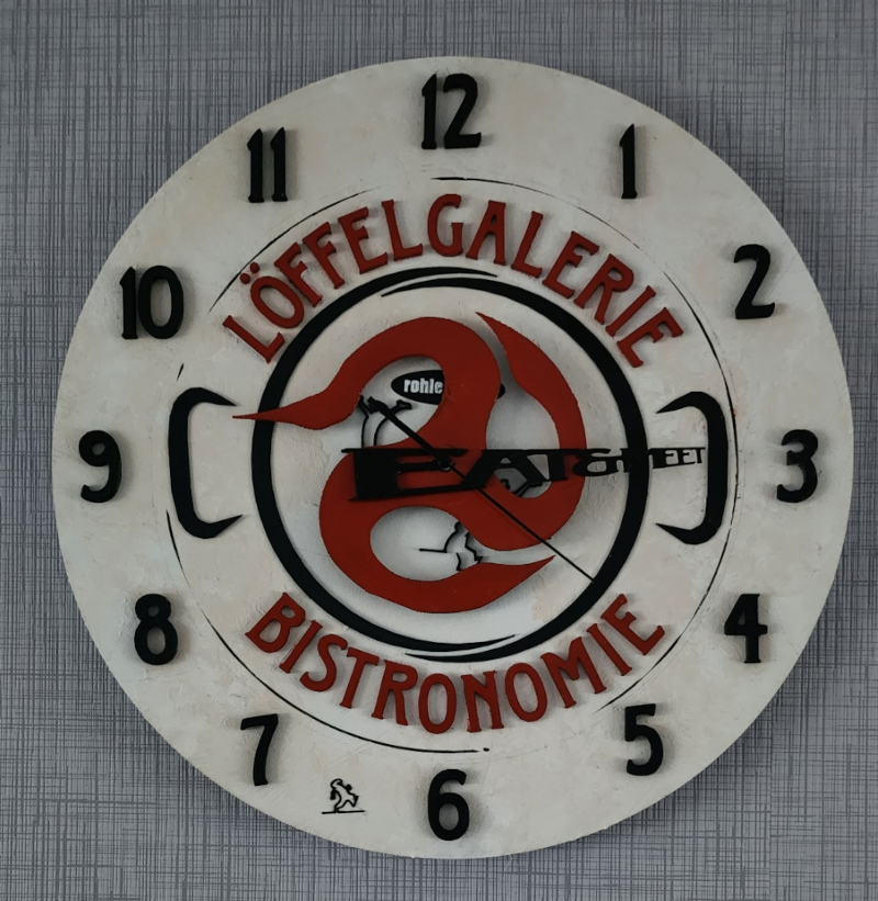 Das Werk ist auf Kunststoff gedruckt und deshalb relativ leicht. Die Zeiger stellen hier die Leitmotive des Unternehmens dar - Gesund und Schön.