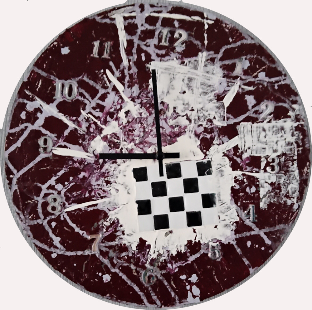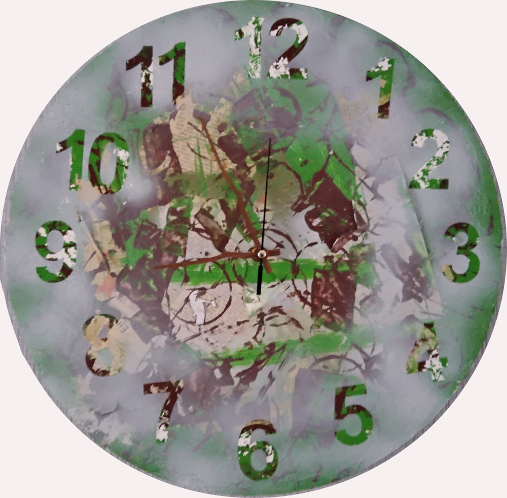 Ein Versuch Die Uhr hat den Durchmesser von 35 cm. Die Uhr wird mit einer AA - Batterie betrieben. Ein Unikat des noch unbekannten Künstlers.